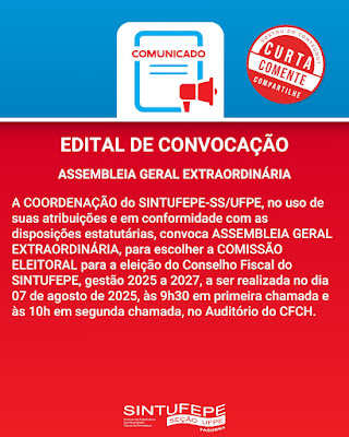 A COORDENAÇÃO do SINTUFEPE-SS/UFPE, no uso de suas atribuições e em conformidade com as disposições estatutárias, convoca ASSEMBLEIA GERAL EXTRAORDINÁRIA, para escolher a COMISSÃO ELEITORAL para a eleição do Conselho Fiscal do SINTUFEPE, gestão 2025 a 2027, a ser realizada no dia 07 de agosto de 2025, às 09:30h em primeira chamada e às 10h em segunda chamada, no Auditório do CFCH.